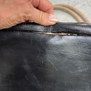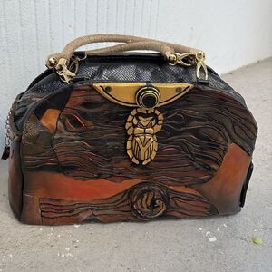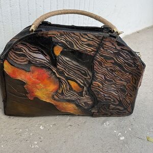 Artist signature is on this bag. It is a great vintage large handcrafted leather bag. Check out the pictures. It’s not perfect as you see but it’s real good. Measuring across at the bottom is 15.5 x 10 x 5.5. This would work as a great overnight bagrope handles are 10.5 inches.