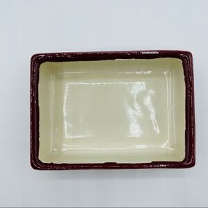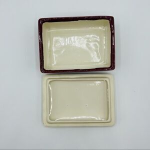 His cute little vintage trinket box is in excellent condition. There are no chips or cracks. It’s ceramic and is signed on the bottom, which makes me think it’s handmade. The lid is white with bisque ceramic strawberries and flowers on top. I really love the bisque design on top! It’s approximately 5 1/2” x 4”.