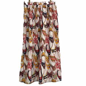 Colorful and whimsical shoe design. Pinks, black, greens and golds. Fabric feels like a cotton blend- has a silky feel. Low wrinkle fabric. Lightweight fabric. White lining. Back or side zip. Quality construction/sewing. Great condition- no flaws. I am calling this a size Small- SEE MEASUREMENTS BELOW FOR YOUR SIZE AND FIT: