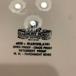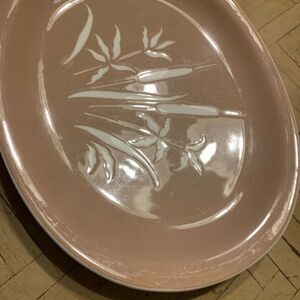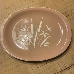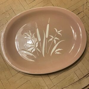 Vintage Harmony House Marshland #4638 platter from 1950s. Color is parchment beige, has a slight pinkish mauve undertone to it. Cat tail & foliage pattern. Nice large size neutral serving platter that will coordinate w many different types of decor. Approximate 13.5” long, 10” wide.