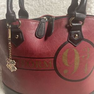 Vintage Harry Potter Platform 9. 3/4 handbag burgundy with black trim .and gold tone accents top zipper the spacious inside lining has a side zipper two side pockets pre owned in good used condition normal wear see all pictures any questions please message