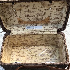 Mid-century travel make up bag. Please look at the pictures as it does need some cleanup but the fabric tweed is all in good condition. Leather has darkened with age and the brass needs clean up and shows where. Not the original shoulder strap as they didn’t come with shoulder straps but this one matches pretty well. Measures 15 x 8 1/2 x 8 1/4