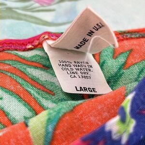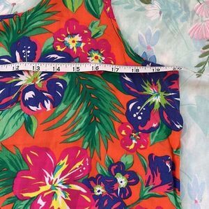 Vibrant!!! Lightly if at all worn Hawaiian print, plumeria flowers on an orange background. Sized L but could fit a range depending on how you’d like it to fit. Measurements are in photos, it is very lightweight but not see through.