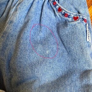 Baggy waist tapered into a straight leg, great gently used vintage condition with just one white marking circled and photographed for disclosure. Waist has built in elastic, no cracking present and fully functional. Front pockets have red and navy heart and floral embroidery details. Single stitch throughout. Between light and regular wash, minor fade in the denim.