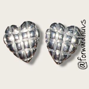 Add timeless charm to your collection with these vintage heart-shaped clip-on earrings. Crafted from silver tone metal, each earring features a distinctive textured surface resembling a woven or quilted pattern. Measuring just over 1 inch in length, they offer a bold yet elegant silhouette. The clip-on backs are secure and comfortable, making them ideal for non-pierced ears.