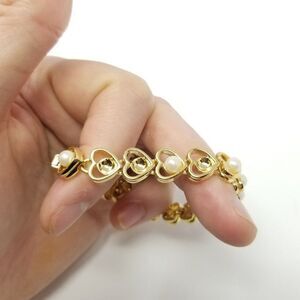 Vintage Heart Shaped Link Gold Tone Bracelet with Faux Pearls, Missing some