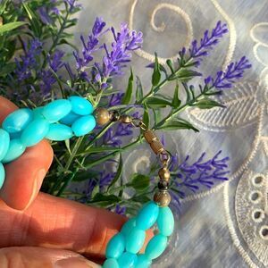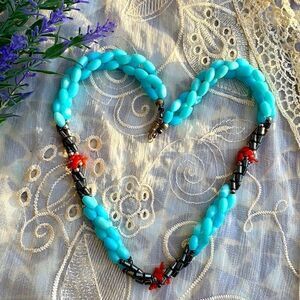 Here’s a unique vintage piece no one else will have! Genuine Hematite. Genuine Red Branch Coral pieces. Combined with turquoise colored acrylic cat’s eye beads with very pretty chatoyance, unlike anything I’ve seen in quite a while.