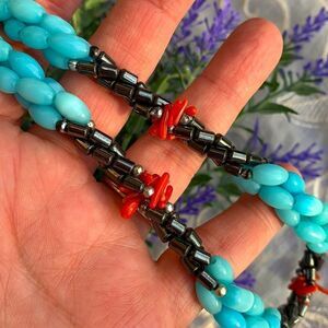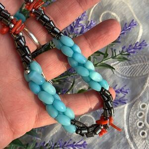 Vintage Hematite, Red Coral & Turquoise Cat’s Eye Bead Twisted Necklace