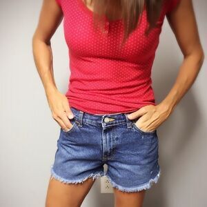 Vintage Bongo high-waisted shorts. A few spots of intentional distressing. Frayed hem. Good used condition. Size 3.