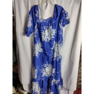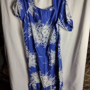 Vintage blue and white Hilo Hattie mumu dress with tiered bottom. chest 23" length 53". UU
