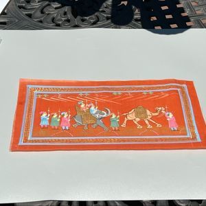 Vintage antique. Delicate fine silk cloth with hand painted scene depicting a procession with an elephant and camel. Intricately detailed. Unsigned and not framed. Very good condition.