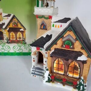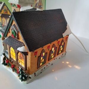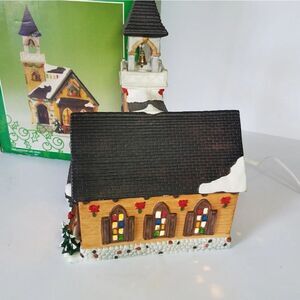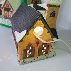 Holiday Traditions 11 inch Lighted Porcelain Church. This item is in box with all its components. Comes with a 5 ft cord with a switch and bulb that illuminates the house.