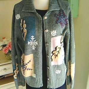 Vintage Wool blend cardigan with winter symbols: snowflakes and leaves. Ribbed collar, bottom and cuffs. Beautiful silver buttons with tree design. Size L measures 46 at chest, 42 at bottom. 25 long from shoulder to hem. Wonderful for Winter.