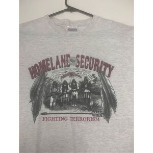 Mens gray cotton multicolored graphic vintage Homeland Security American Patriotic T-shirt. Excellent vintage condition. Mens size medium.
