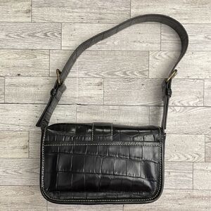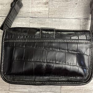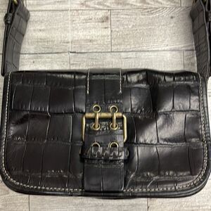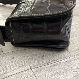 Vintage Hype Black Embossed Leather Bag. Front flap magnetic closure with inside zip pocket, backside pocket. Excellent condition with very minor signs of wear that comes with age on a vintage item. Dust bag included. Measures 8.5” x 5.5” x 3.5” with a strap drop of 10”. Adjustable strap can be adjusted up to another 2”