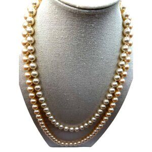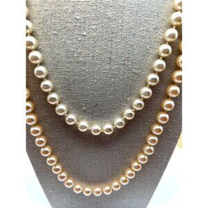 This exquisite two necklaces offers a touch of timeless elegance. Each glass pearl is meticulously knotted, ensuring durability and showcasing a classic look. The perfect accessory to elevate your style and add a sophisticated charm to any ensemble. Could each be worn as a single necklace or together to make a double strand.