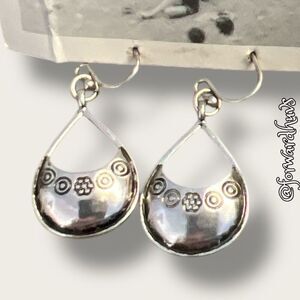 A beautiful pair of vintage-style dangle earrings featuring a unique crescent-shaped silver-tone design with intricate stamped circular and floral motifs. These earrings have an antique, bohemian aesthetic reminiscent of traditional handcrafted jewelry. They are lightweight and delicate yet durable, making them perfect for everyday wear or special occasions.