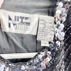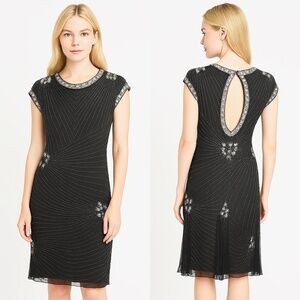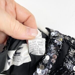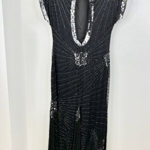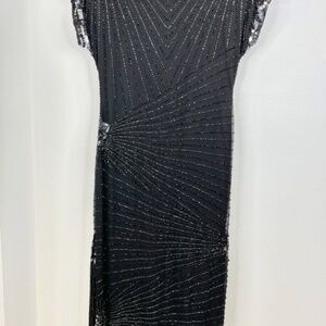 This stunning black beaded cocktail dress channels timeless 1920s Art Deco glamour. It features intricate hand-beading throughout, with silver and black sequins arranged in elegant, slimming chevron and starburst patterns. The capped sleeves, keyhole back, and knee-length hemline add sophisticated detail, while the soft sheer overlay creates subtle movement and sparkle under light. Perfect for weddings, holiday parties, or evening events. A couple of tiny beads missing under 1 armpit- See Photo