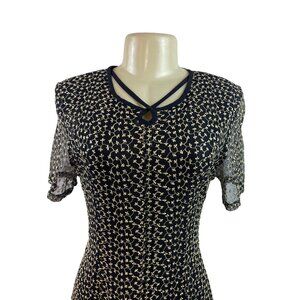 Vintage-Inspired Black & Beige Floral Midi Dress With Sheer Sleeves & Tie-Back