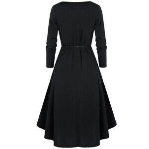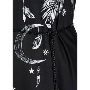 Vintage-Inspired Black Moon & Feather Print Dress Rope Belt And Pockets