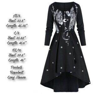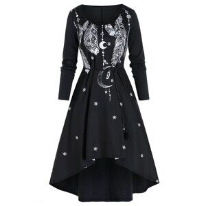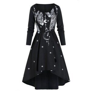 Step into a world where the mystical meets the chic with this vintage-inspired dress adorned with celestial moon and feather prints.
