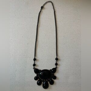 Turn heads with this bold black bib necklace featuring a stunning oversized center stone surrounded by teardrop and round black accents in an antique silver-tone setting. Perfect for adding drama to evening wear or elevating a simple top or dress.