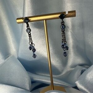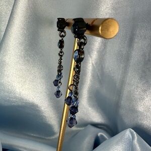 Delicate and elegant, these vintage-inspired drop earrings feature shimmering blue crystals in a graceful chandelier design. The gunmetal-toned setting adds a romantic and slightly edgy contrast, making these the perfect accessory for both formal occasions and elevated everyday looks. Lightweight and versatile, they bring just the right amount of sparkle to any outfit.