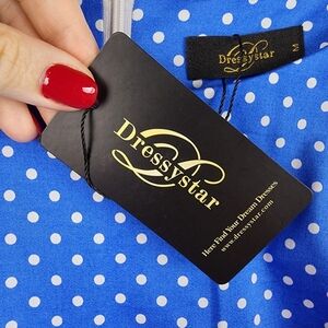 Step into a charming retro-inspired look with this Dressystar polka dot A-line dress. Featuring a flattering fit-and-flare silhouette, this dress is perfect for a variety of occasions, from casual daytime outings to semi-formal events. The cap sleeves and elegant bateau neckline enhance its classic appeal, while the included matching waist tie adds shape and definition to the waistline. Made from a lightweight fabric, this dress offers ease of movement and style. A hidden zipper at the back ensures a sleek fit, while the playful polka dot pattern adds a touch of timeless fun.