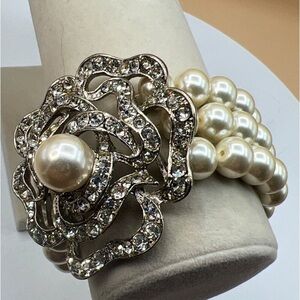In the realm of timeless elegance, this bracelet weaves a tale of grace and sophistication. Adorned with lustrous faux pearls, it captures the essence of classic beauty. The silver tone flower glistens with rhinestone charm, making it an exquisite accessory that whispers stories of glamour and allure to its beholder.