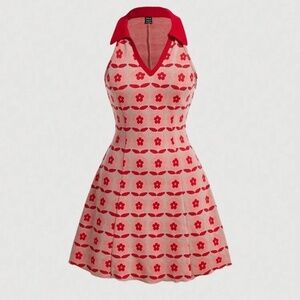 βοΈ Chic Halter-Neck Design β Featuring a flattering deep V-neck with a bold red collar, this dress is perfect for making a statement.