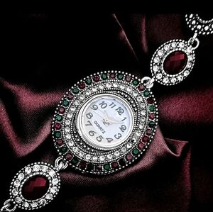 Elegant silver-tone frame Red and green faceted gemstone details Decorative antique-inspired metalwork Easy-to-read quartz dial Secure clasp for all-day comfort