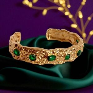 Vintage gold cuff bracelet, 18K gold plated bracelet, green zirconia bracelet, gold bangle, vintage-inspired jewelry, statement cuff bracelet, luxury gold bracelet, emerald green bracelet, gold bracelet for women, adjustable cuff bracelet, classic gold jewelry, timeless bracelet, bold fashion jewelry, designer-inspired jewelry, gold wrist cuff, jewelry gift for her, Mother's Day jewelry gift, elegant jewelry for mom, trending bracelets 2025, fashion jewelry trends, women's accessories, unique gift idea, fall jewelry trends, summer jewelry