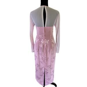 This elegant, handmade Ao Dai-style dress features a soft pink hue with delicate floral embroidery, creating a timeless and feminine silhouette. The dress is beautifully tailored with sheer long sleeves and a fitted bodice, making it ideal for formal events, cultural celebrations, or unique vintage-inspired fashion moments.