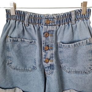 These retro-style baggy light wash lightweight denim shorts feature an elasticized high waist with a button fly front, light wash, four roomy patch pockets (front and back), and rolled cuffs for a relaxed, casual vibe. The soft, broken-in feel and easy pull-on design make them perfect for summer days, festivals, or laid-back weekends.