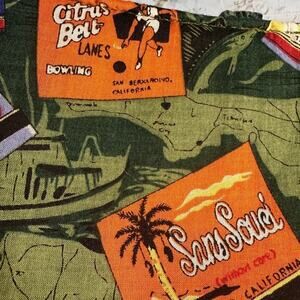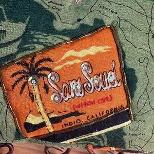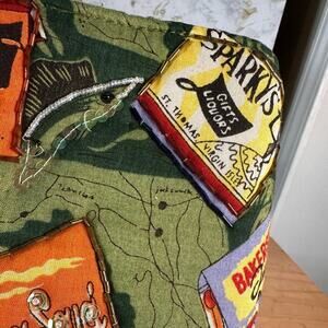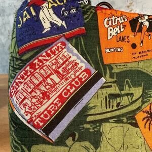 Bring a pop of island charm to your look (or your home decor) with this fun and vibrant small tote bag. Tropical green fabric base with colorful retro-inspired patches (bars, travel, palm trees, tiki vibes). Sturdy dark wood handles for a stylish vintage touch. Lined with bright green fabric, roomy enough for your essentials.