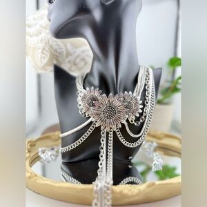 Bold, unique, and full of personality — this dramatic layered choker necklace features intricate sunflower details and cascading chains for an unforgettable look. Designed to sit high on the neck with an extended front drop, it blends vintage charm with modern edge. A true show-stopper.