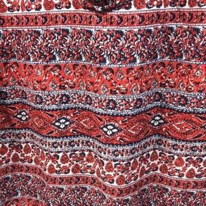 This sleeveless blouse evokes a timeless charm with its intricate red and blue pattern reminiscent of vintage textiles. The delicate keyhole detail adds a touch of elegance, while the lightweight fabric ensures comfort. A versatile piece that embodies a classic aesthetic, crafted with care and attention to detail.