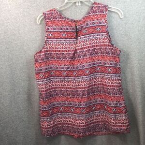 Vintage-Inspired Mileage Sleeveless Red & Blue Patterned Blouse With Keyhole Det