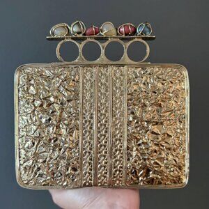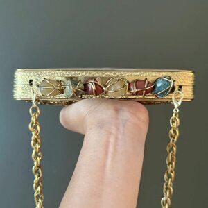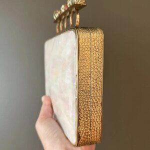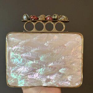 Add a touch of luxury to your evening look with this one-of-a-kind clutch. Featuring a stunning iridescent mother-of-pearl shell front, a richly textured gold-toned metal back and sides, and a unique knuckle-style clasp adorned with natural gemstones, this piece is both elegant and edgy.