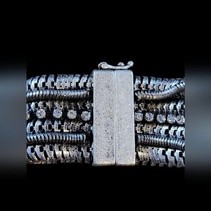 This striking bracelet features a multi-row design with intricate silver-tone metal links, accented by sparkling rhinestones that catch the light beautifully. Its bold yet elegant style makes it a statement piece perfect for any occasion. The magnetic clasp ensures a secure fit and adds modern convenience to this timeless design.