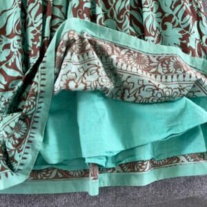 - Color/Pattern: Aqua green with bold brown floral + scroll print