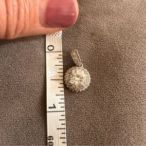Elegant vintage-style pendant featuring an oval-cut clear cubic zirconia center surrounded by a halo of smaller stones in a detailed milgrain silver-tone setting. The bail is also adorned with shimmering stones for extra sparkle. Measures approx. 1” long. Gorgeous for pairing with a delicate chain or adding glam to a layered necklace look.