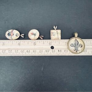 Unique pendant set featuring insect and fleur-de-lis designs. Perfect for adding a vintage touch to any outfit.