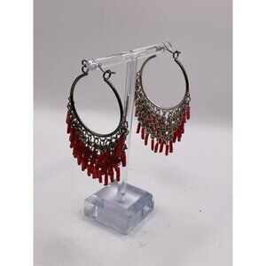 Vintage-Inspired Red Beaded Hoop Earrings With Silver-Tone Chains