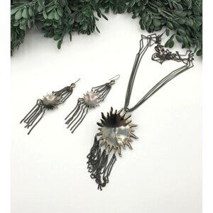 This exquisite necklace and earring set features a captivating sunburst design adorned with sparkling rhinestones. The intricate chain detailing adds a touch of vintage elegance, making it a sophisticated addition to any jewelry collection. Ideal for those who appreciate timeless beauty and refined craftsmanship.