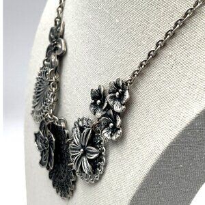 This vintage-inspired silver floral statement necklace captures the essence of romantic botanical design with its antique finish. The adjustable chain ensures a comfortable fit, making it a timeless piece for any jewelry collection.