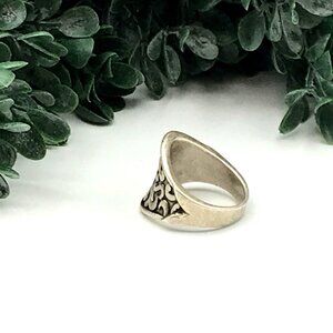 An intricately designed silver tone ring featuring a bold swirl pattern. Great for daily wear or as a statement piece in your collection.