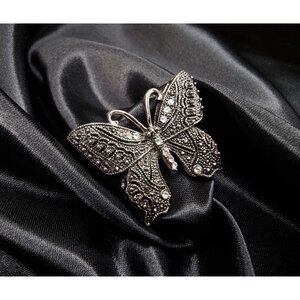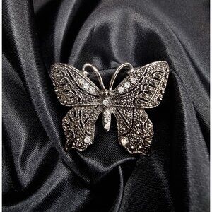 This striking butterfly brooch is a delicate dance of darkened silver-tone metal, clear rhinestones, and intricate beading. The openwork wings are decorated with pavé-style marcasite accents and dazzling stones that shimmer like dew at dawn. Its symmetrical form and sculptural details give the piece a regal, Victorian-inspired charm.