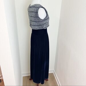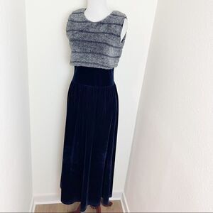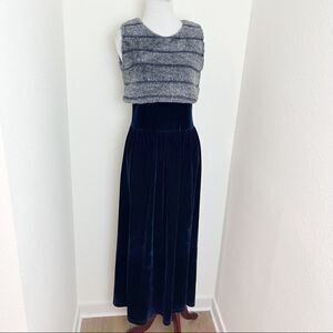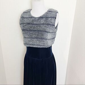 I fell in love with the uniqueness of this dress. It's a Navy Blue Velvet Skirt with a Grey Faux Fur Striped Crop Top on Top. It has an elastic waistband with a back zipper closure.