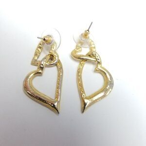Vintage Interlocking Heart Dangle Stud Earrings, Gold Tone Rhinestone, Sweet
